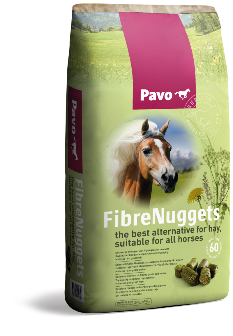 Pavo FibreNuggets kunnen worden ingezet als hoogwaardige ruwvoervervanger. De grote structuurrijke grasbrokken, gemaakt van 100% weidegras uit de voor-Alpen in zuid-Duitsland, bevorderen kauwen en speekselvorming bij je paard
