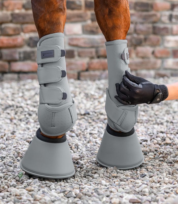 De Air Performance fetlock-gaiter werd ontwikkeld voor functioneel gebruik in de training. Het zachte softshell-materiaal in combinatie met schokabsorberende vulling vermindert de belasting op pees- en ligamentstructuren. De luchtdoorlatende, geperforeerde materiaalstructuur ondersteunt een continue luchtcirculatie en helpt de temperatuur te reguleren. Een anatomisch geplaatste uitsparing in het voorste gebied maakt onbeperkte mobiliteit van het koetgewricht mogelijk. De robuuste klittenbandbevestiging met rubberen handvat zorgt voor eenvoudige bediening en een stevige pasvorm. Maat M: twee klittenbandsluitingen, maat L & XL, elk drie klittenbandsluiters. Koppel.