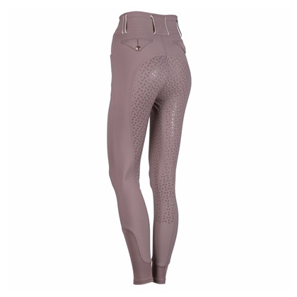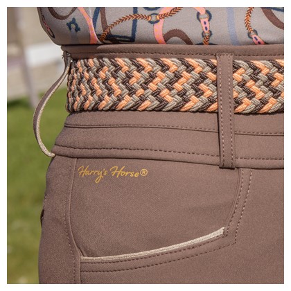Chique rijbroek met een brede tailleband. De riemlussen op de achterkant hebben een subtiele goudkleurige bies. Verder een dubbele schuifknoopsluiting, twee steekzakken met een goudkleurige bies, twee imitatie kontzakjes, een rondgenaaid zitvlak met een alloverprint met bitjes en een comfortabele elastische inzet rond de enkels.