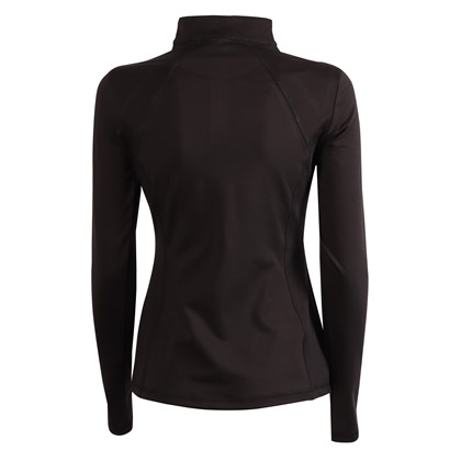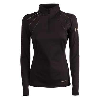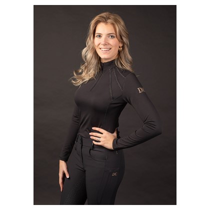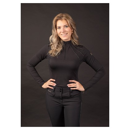 Shirt met lange mouw, opstaande kraag met korte rits. Aan de bovenkant aan de voorzijde van het shirt zijn naast de sierstiksels rijen met kristallen in verschillende formaten geplaatst en het Denici Cavalli logo op de linkermouw.